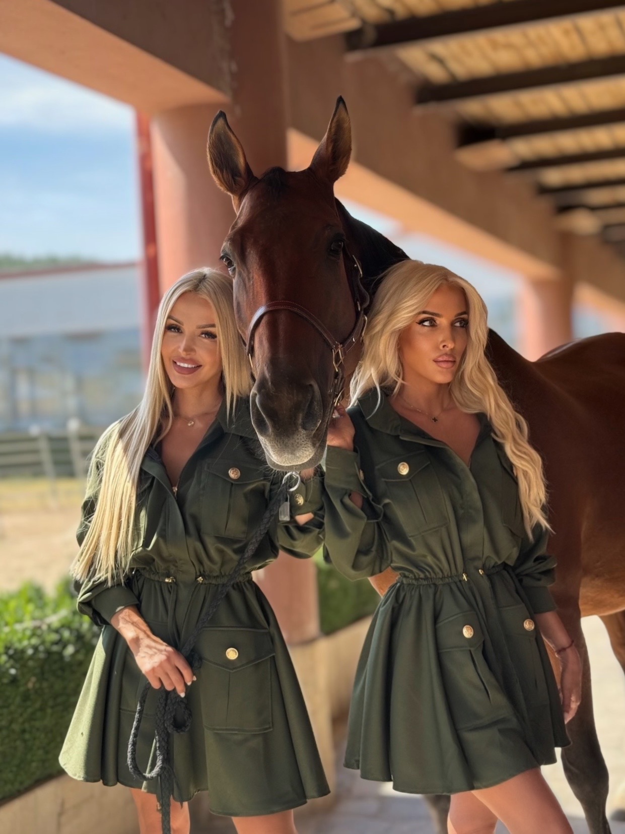 Рокля в маслено зелен цвят със свободен силует и акцент златни копчета и големи джобове – перфектна за комбинация с колан, високи ботуши или сандали. Регулиращата се талия подчертава женствеността, а дизайнът е едновременно практичен и шик.