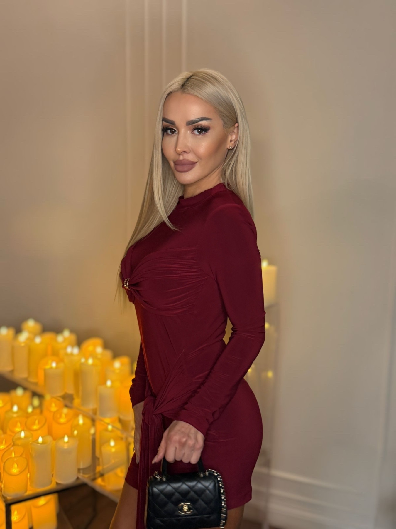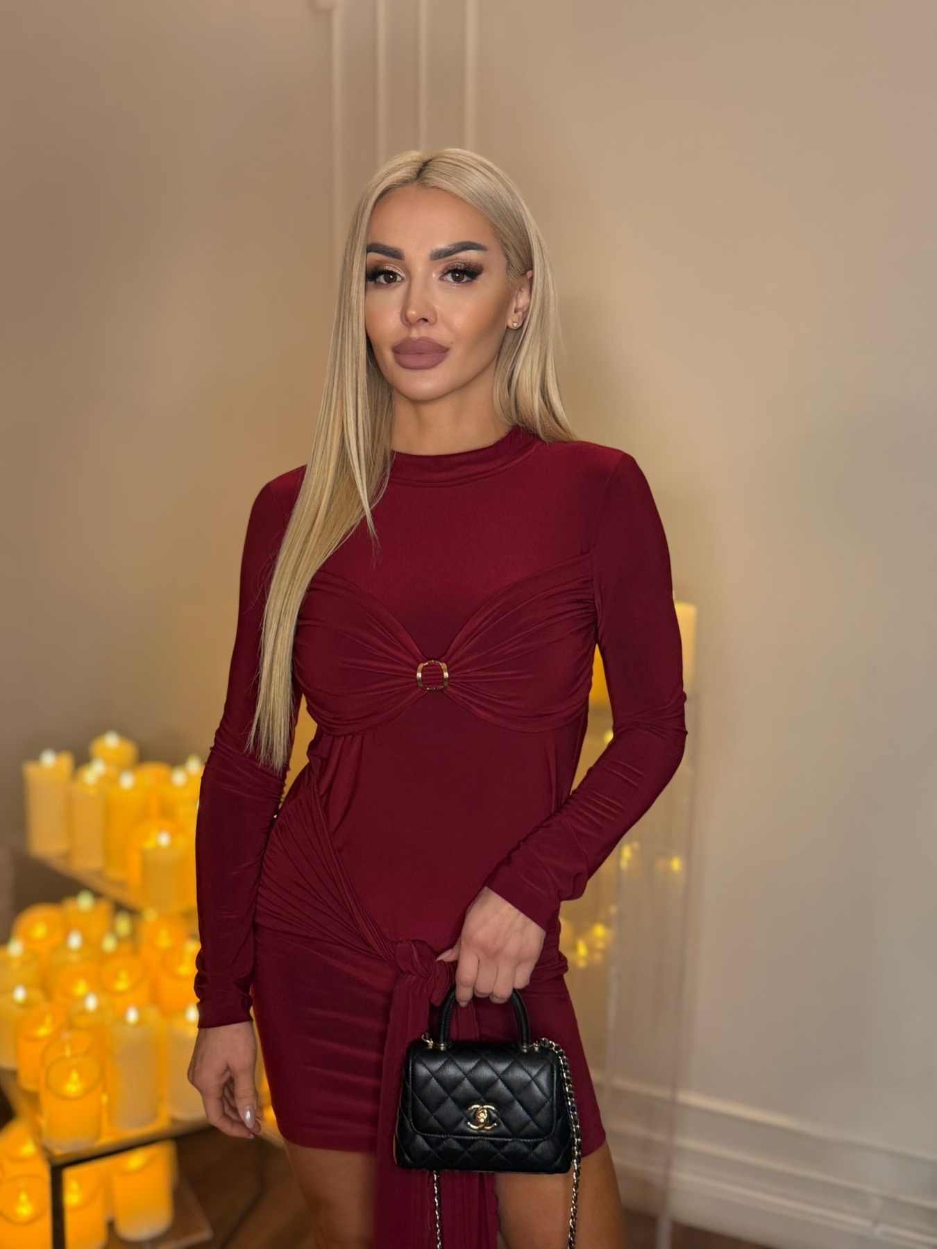 Елегантна рокля от еластична материя в бургунди цвят с дизайнерска кройка и акцент в златно
