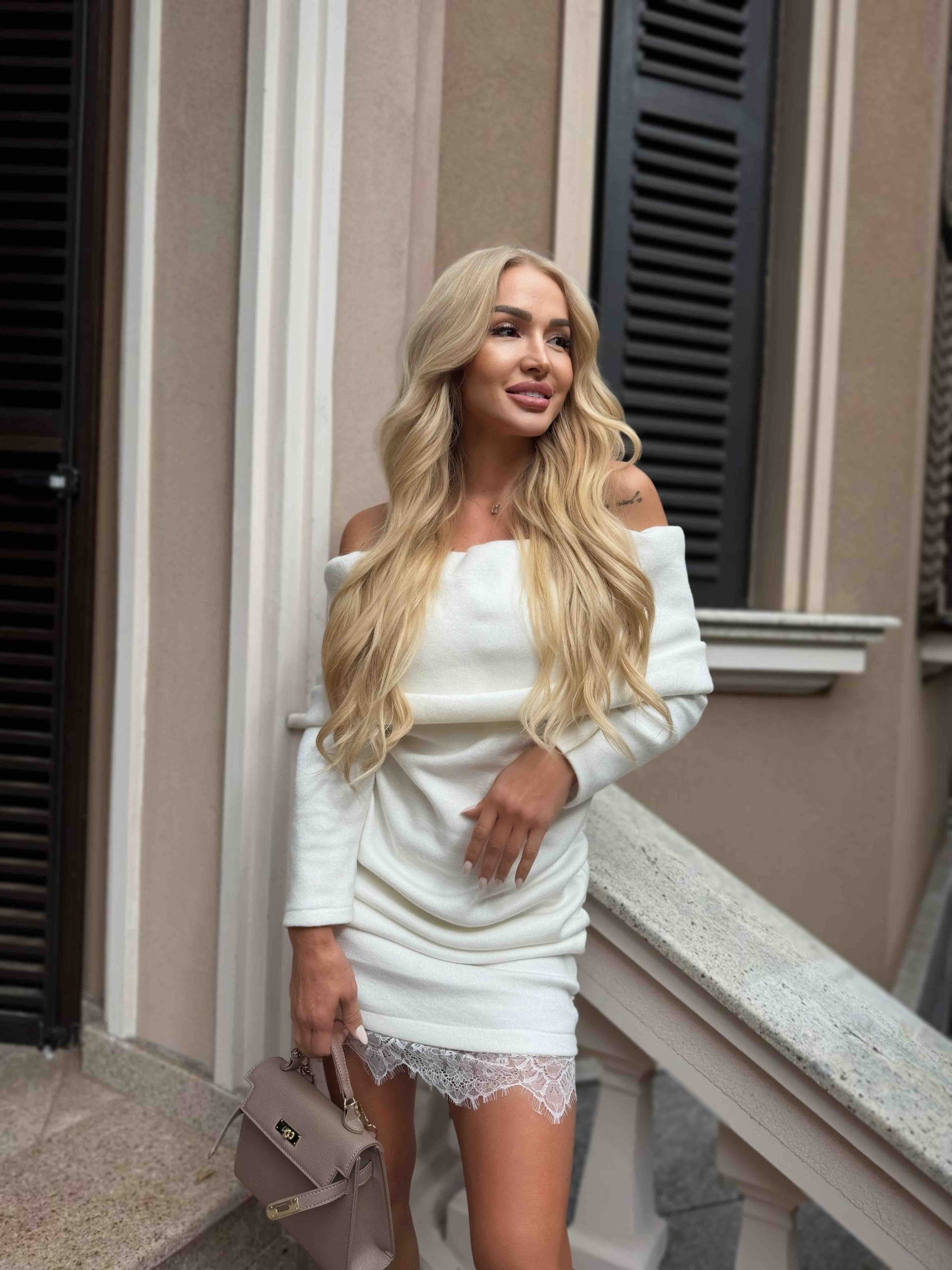 Втален модел, изработен от висококачествено бяло плетиво, който подчертава силуета с изтънчен женствен акцент.