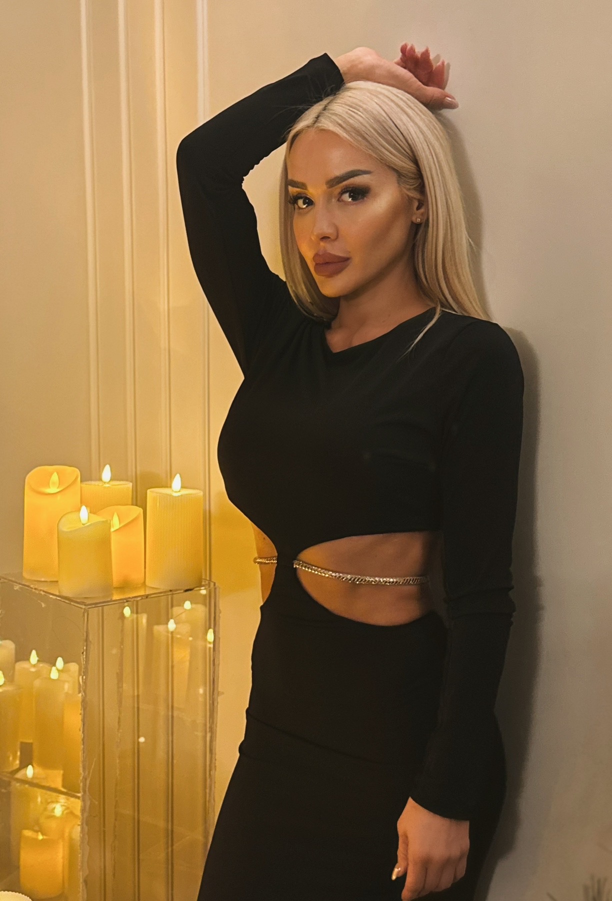 Дълга , елегантна рокля от еластична материя с втален силует и изрязване в талията . Акцентът в дрехата е безупречната линия, подчертана от златно бижу с камъни в талията