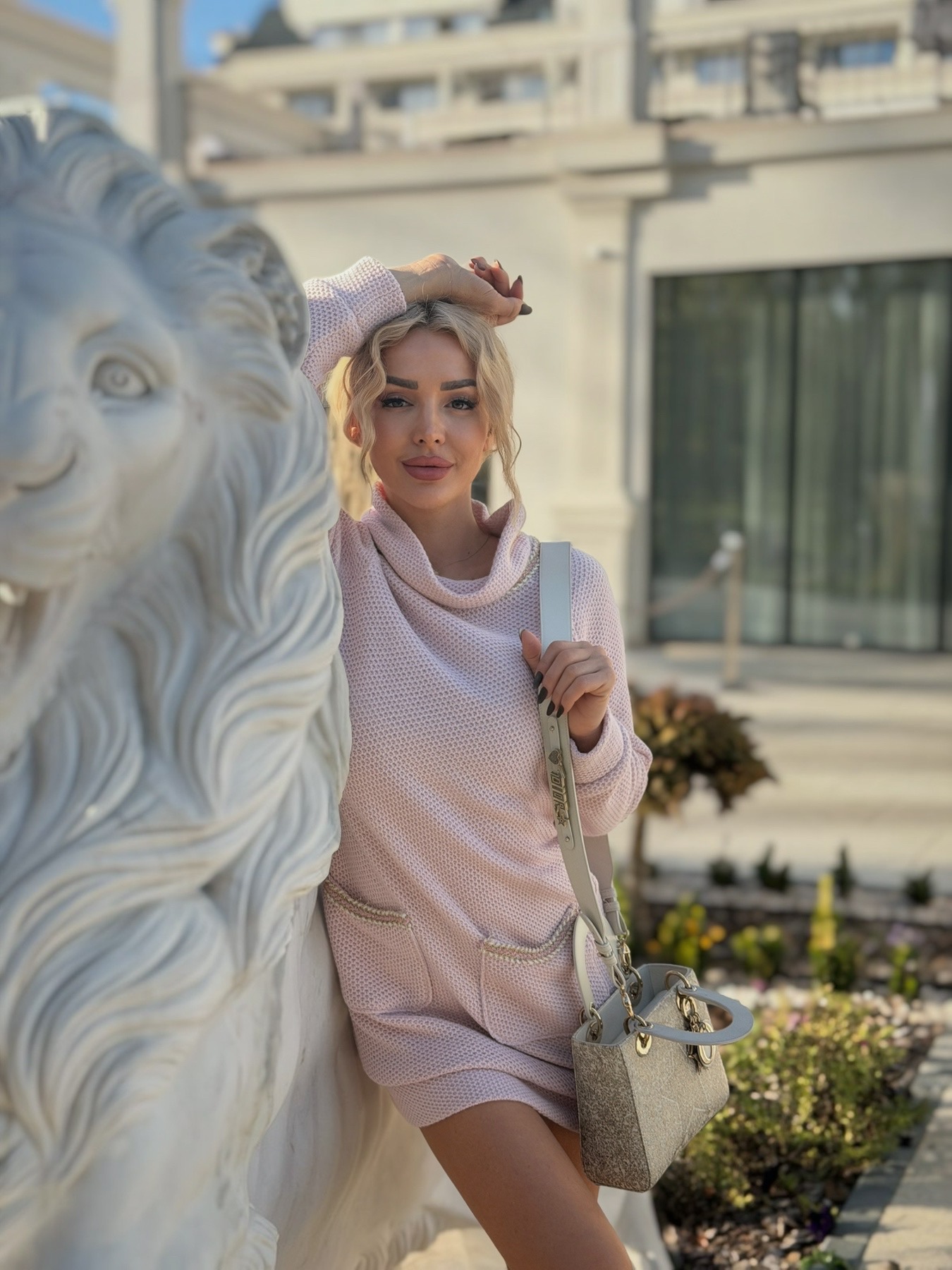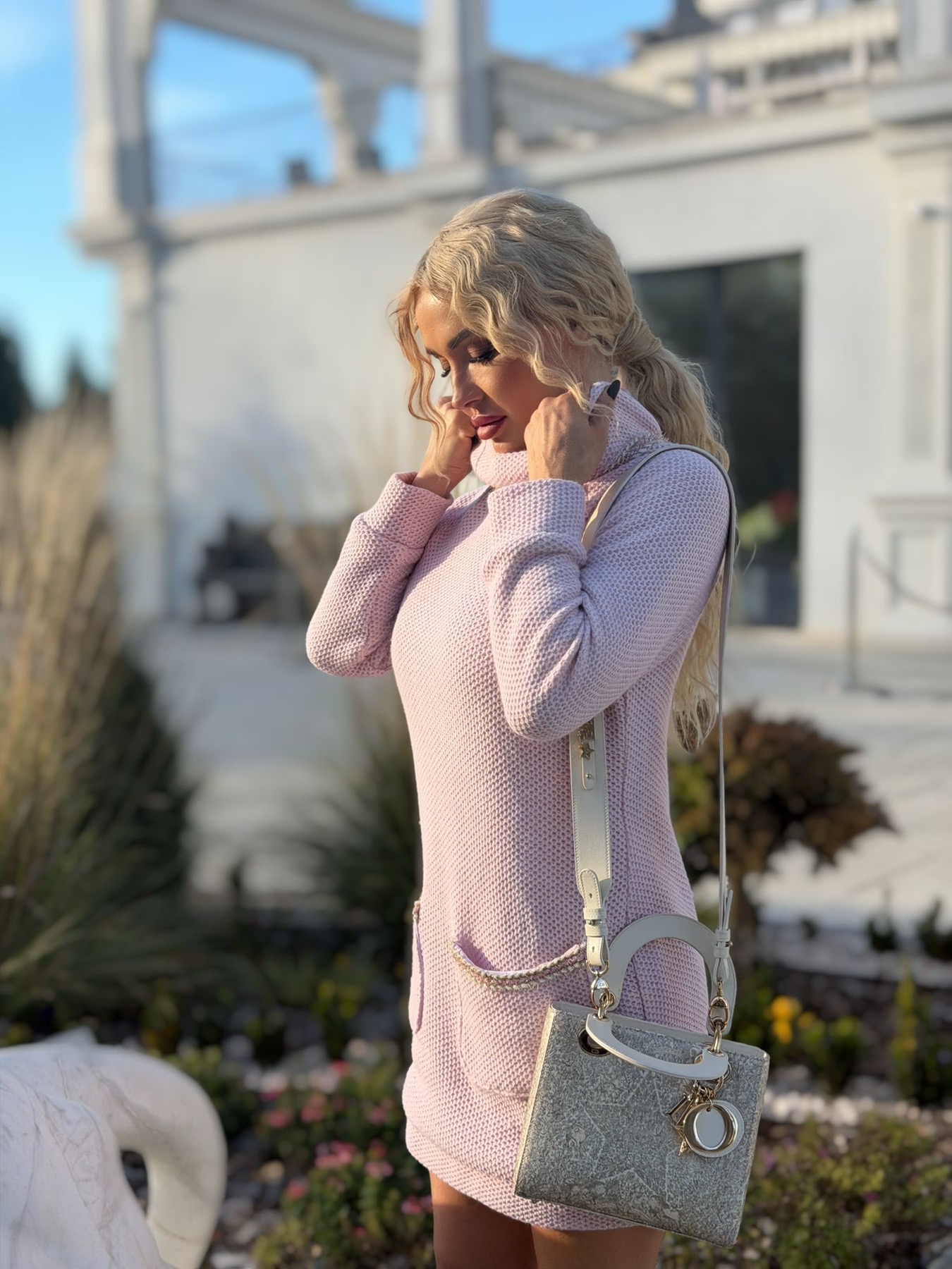 Рокля със свободен силует от розово плетиво с външни джобове ,които са подчертани в ширит в розово и златно